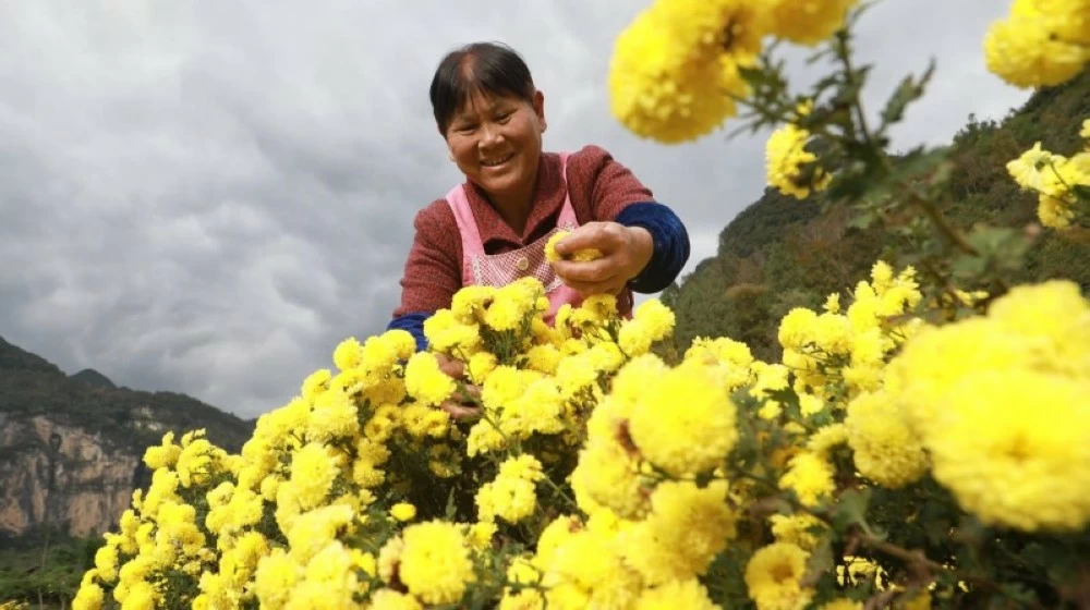في قاعدة زراعة الأقحوان في قرية هونغهوا، ببلدة غونغتان، التابعة لمقاطعة يويانغ توجيا ومياو ذاتية الحكم في الصين، ينشغل مزارعو الأقحوان بقطفه. وفي الصورة إحدى المزارعات أثناء قطف الأقحوان بالقرية. (إيكونومي دايلي الصينية)