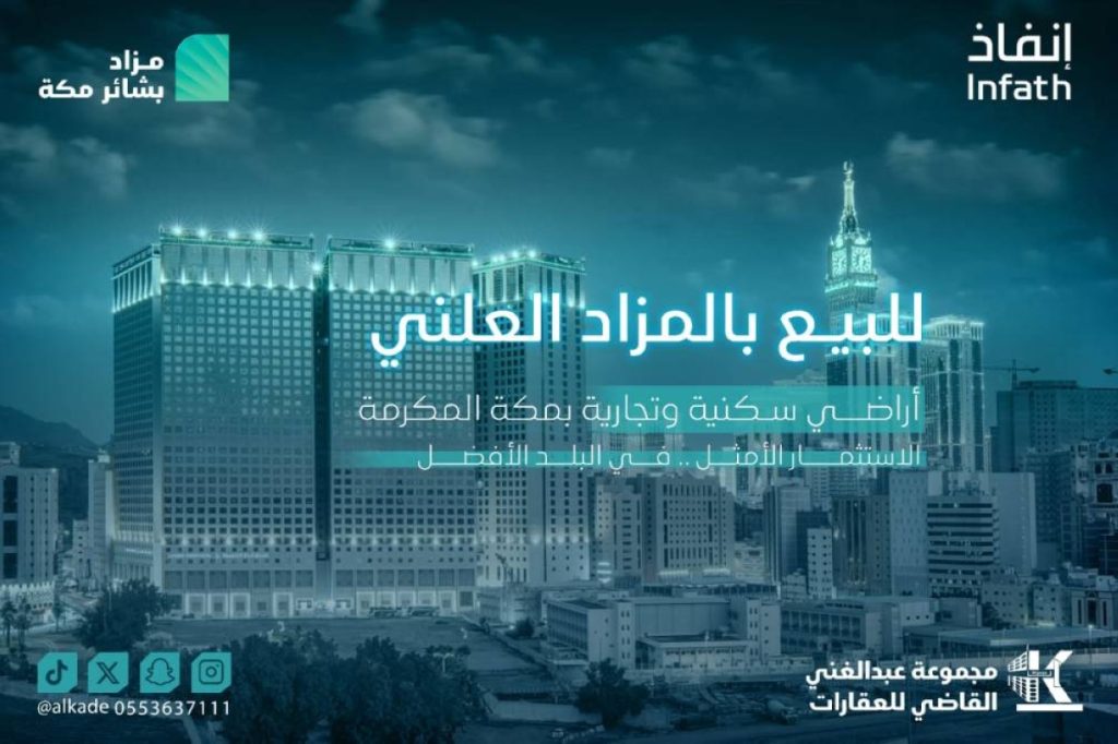 تعلن مجموعة عبدالغني القاضي للعقارات وبإشراف مركز الإسناد والتصفية «إنفاذ» عن إقامة مزاد «بشائر مكة» المدمج، وذلك يوم الأربعاء 2025/10/15 م حضورياً الساعة: 04:30 بقاعة القمرين بمكة المكرمة وإلكترونياً عبر منصة السعودية للمزادات.