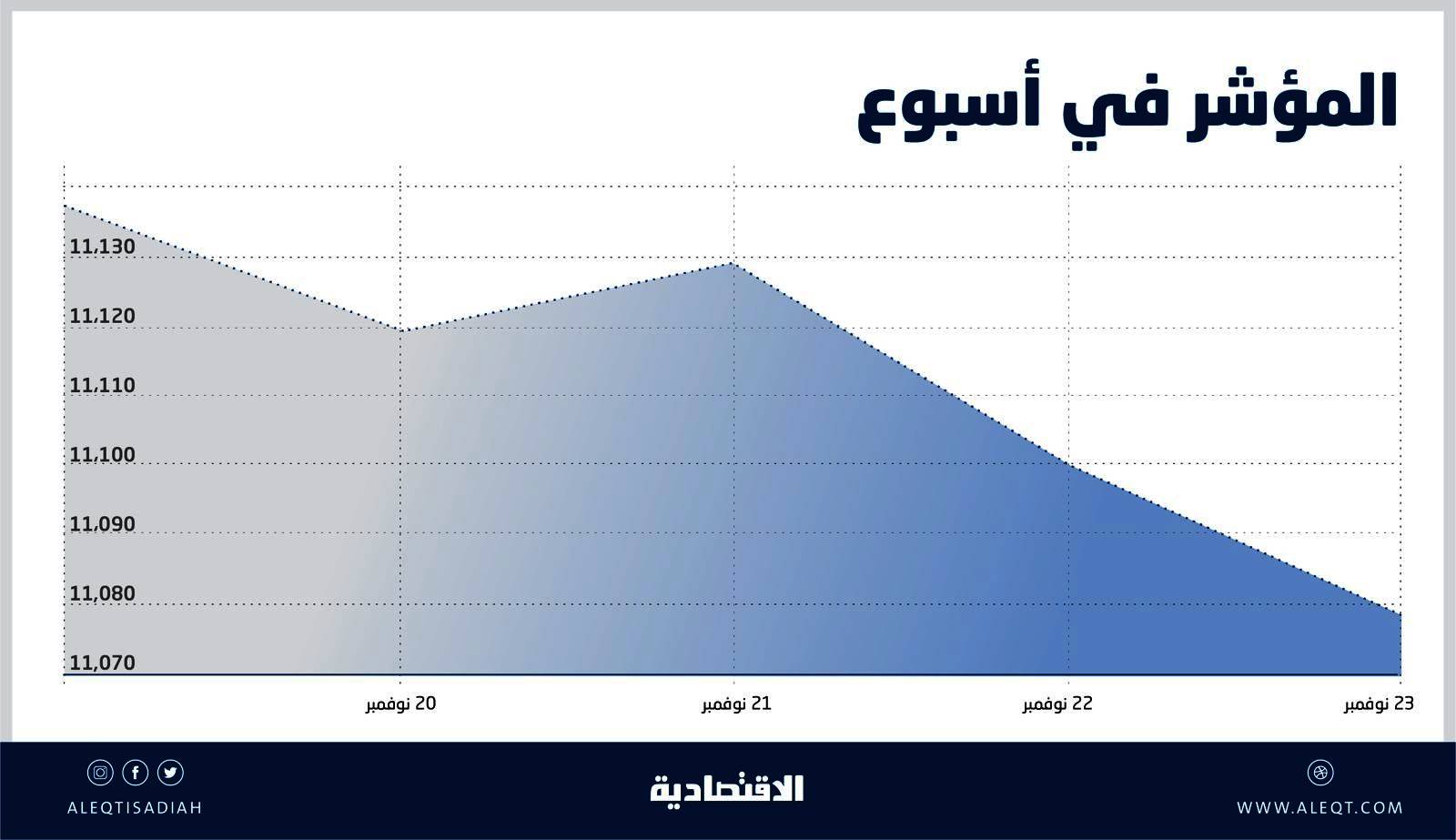 افتتح المؤشر العام الأسبوع عند 11111 نقطة، وكانت أدنى نقطة عند 11050 نقطة فاقدا 0.29 في المائة، بينما الأعلى عند 11149 نقطة رابحا 0.6 في المائة، وفي نهاية الأسبوع أغلق عند 11078 نقطة، تراجعت ثلاث نقاط بنحو 0.03 في المائة.