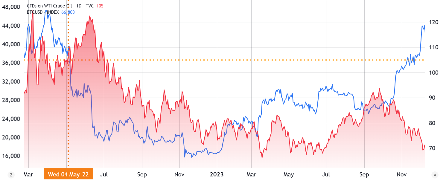 لا يزال ارتباط البيتكوين بالنفط غير مؤكد، حيث من المحتمل أن تؤدي أحداث مثل Mt.Gox وانهيار Terra-Luna إلى تعميق أسواق العملات المشفرة الهابطة السابقة.