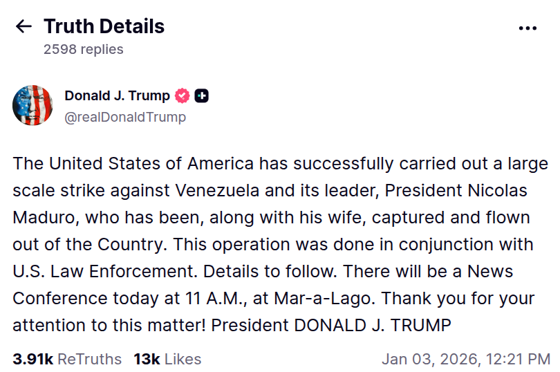 الأخبار التي تفيد بأن الولايات المتحدة شنت غارات جوية على العاصمة الفنزويلية كاراكاس أعقبها إعلان من الرئيس دونالد ترامب على موقع Truth Social قال فيه إن الرئيس الفنزويلي قد تم القبض عليه و”نقله جواً إلى خارج البلاد”.