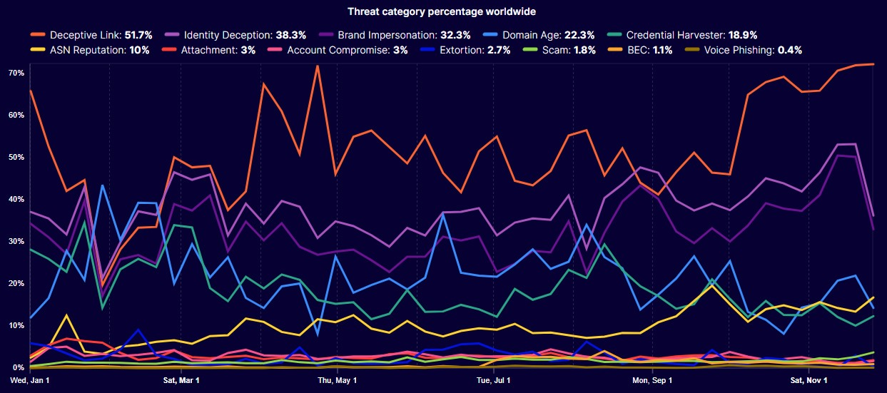 وأفادت أن أكثر من نصف رسائل البريد الإلكتروني الضارة، أو 52% منها، تحتوي على رابط خادع، وهو ما يمثل أعلى فئة من التهديدات.