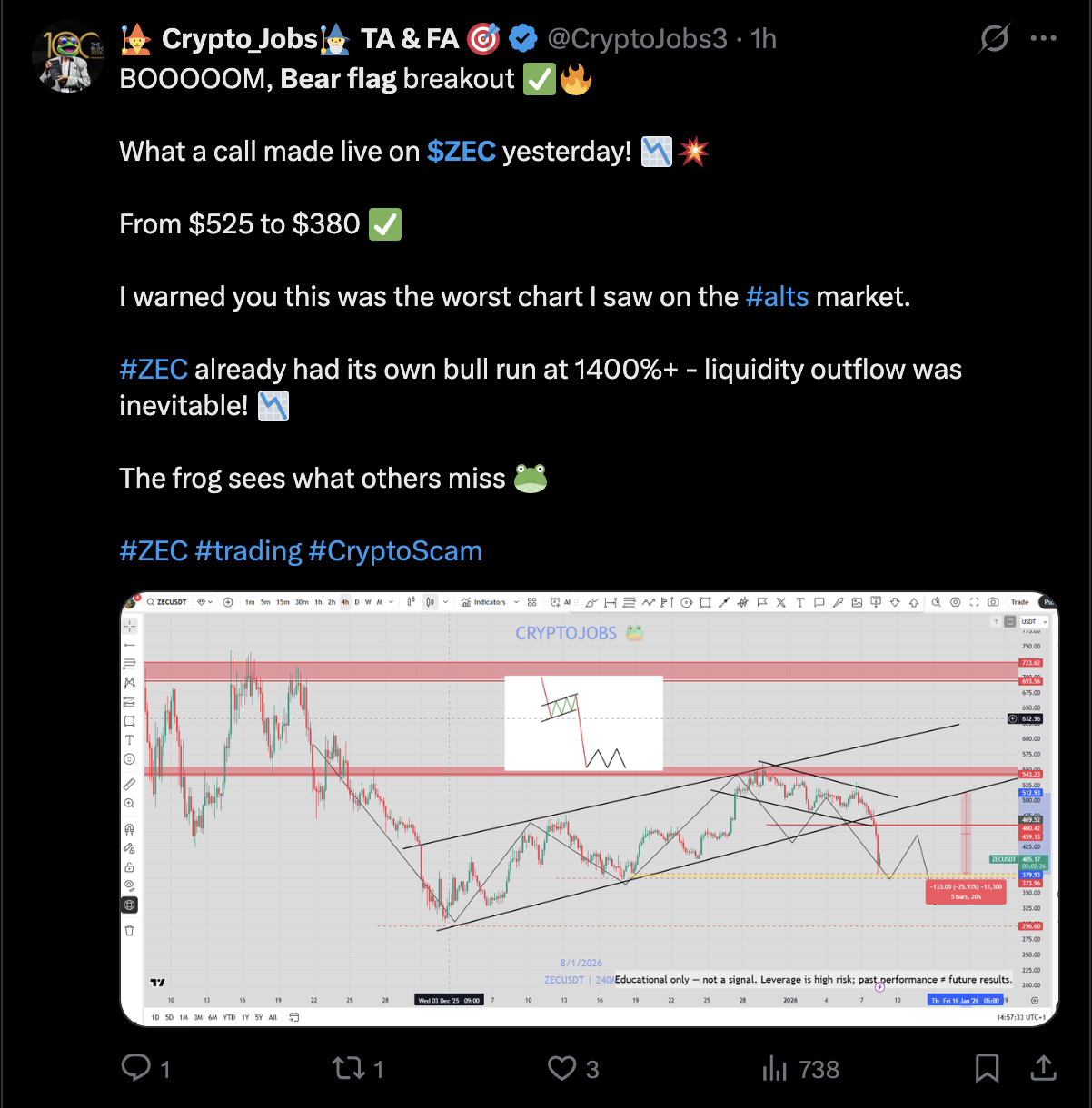 اعتبارًا من يوم الخميس، خرجت Zcash من نمط العلم الهبوطي السائد، مما عزز التحيز الهبوطي.