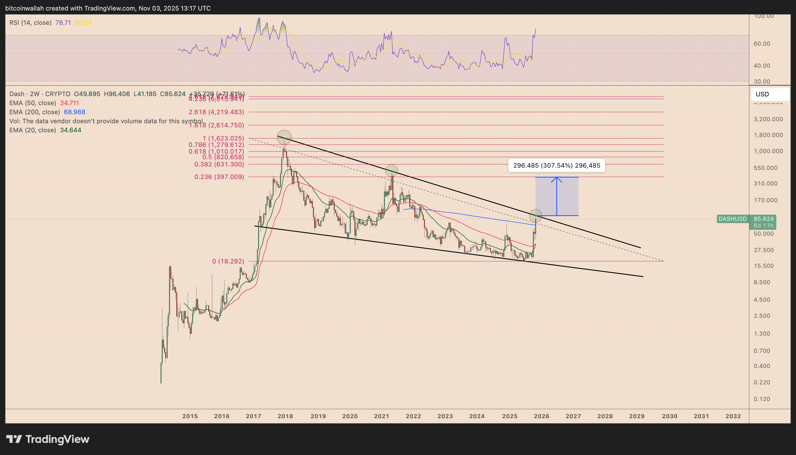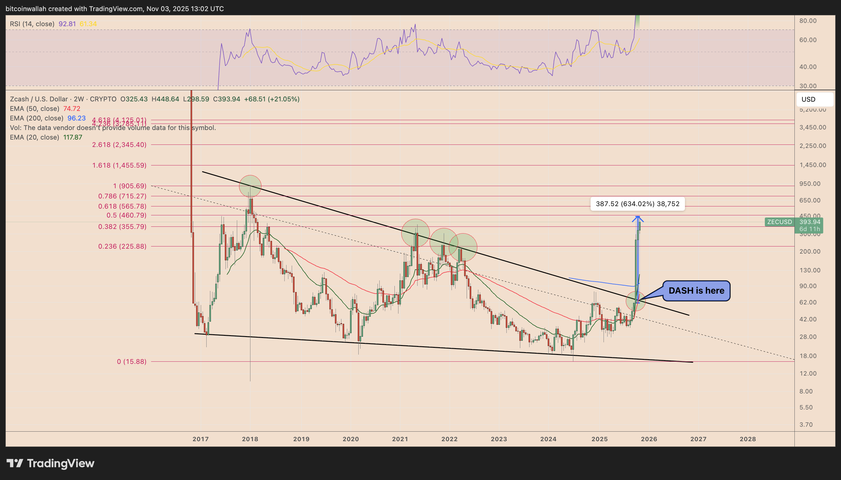 تشترك كل من ZEC وDASH في هياكل طويلة الأجل متطابقة تقريبًا، وتتميز بقنوات تنازلية متعددة السنوات يعود تاريخها إلى عام 2017، تليها محاولة اختراق في أواخر عام 2025.