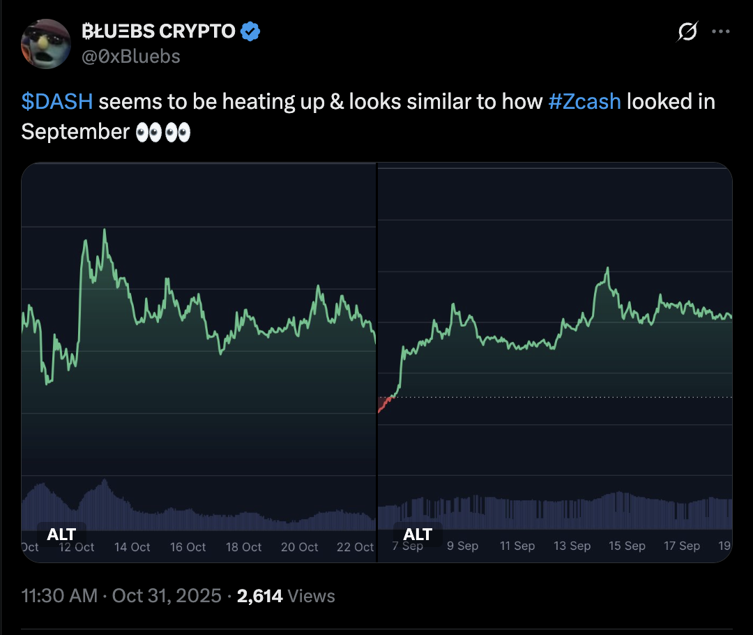 يعكس ارتفاع عملة الخصوصية بشكل وثيق الارتفاع الأخير الذي حققته منافستها Zcash (ZEC)، مما يشير إلى أن Dash قد تستعد لاختراق حاسم خاص بها، مما قد يكرر الحركة المتفجرة التي أرسلت ZEC إلى أعلى مستوياتها في ثماني سنوات.