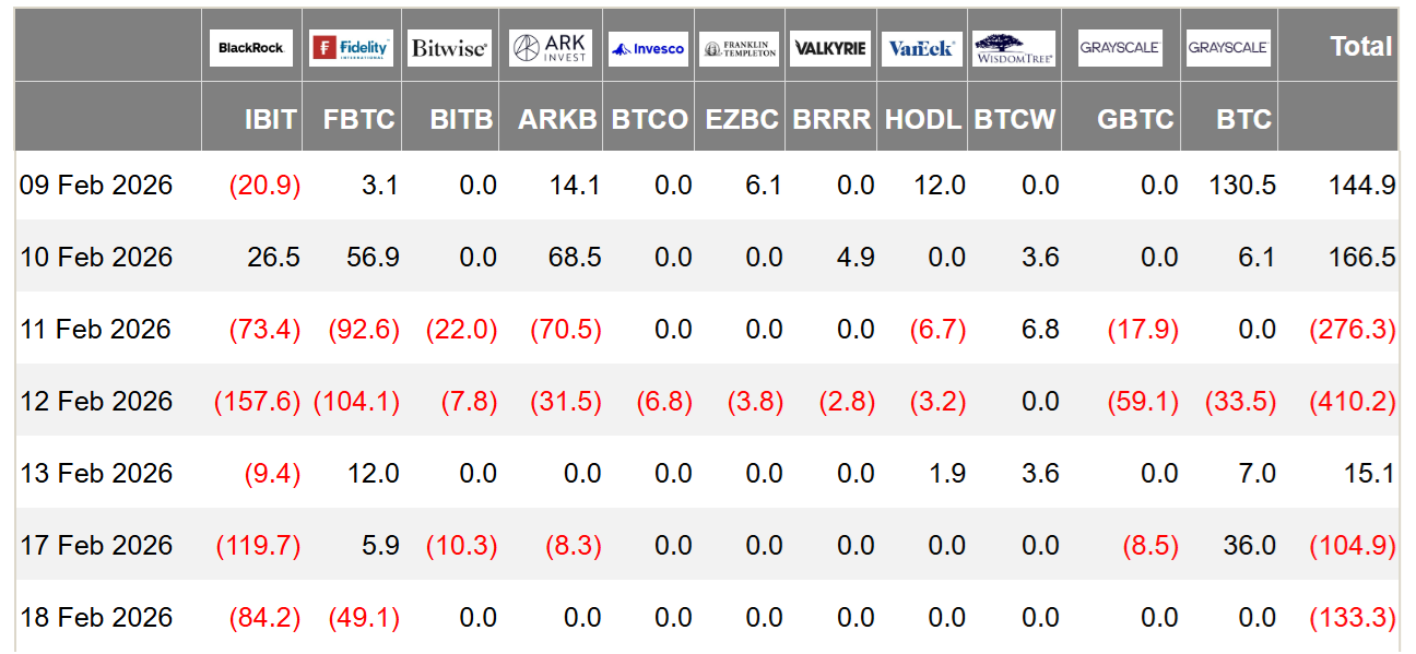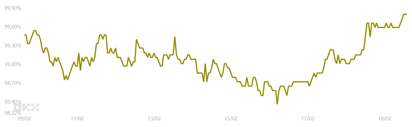 شهدت صناديق بيتكوين المتداولة المدرجة في الولايات المتحدة إجمالي تدفقات خارجة بقيمة 910 ملايين دولار منذ 11 فبراير، وهو ما أدى على الأرجح إلى اختلال توازن الثيران – خاصة وأن تداول بيتكوين أقل بنسبة 47٪ من أعلى مستوى له على الإطلاق بينما تحوم أسعار الذهب بالقرب من 5000 دولار، بزيادة 15٪ في شهرين فقط. وعلى نحو مماثل، ظل مؤشر ستاندرد آند بورز 500 أقل بنسبة 2% فقط من أعلى مستوى له على الإطلاق، مما يشير إلى أن هذا النفور من المخاطرة يقتصر إلى حد كبير على قطاع العملات المشفرة.