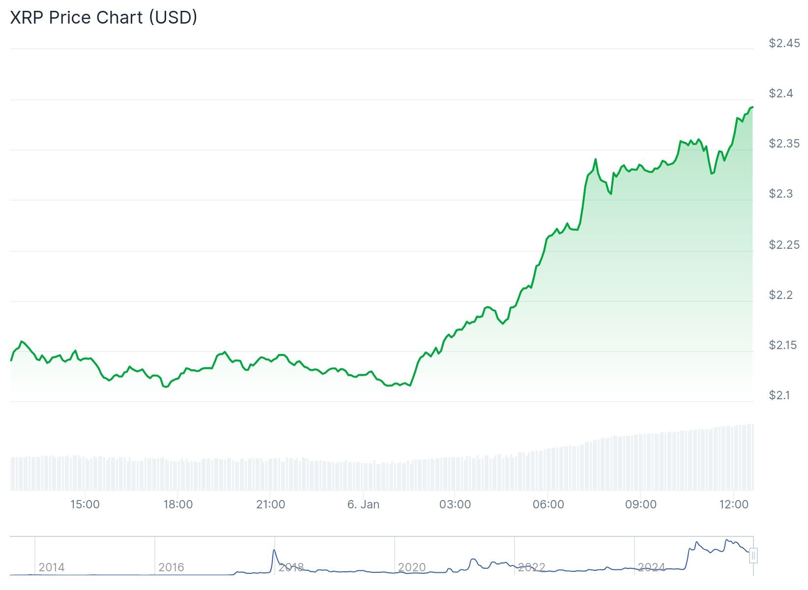 وفي الوقت نفسه، وصلت إيثريوم (ETH) إلى أعلى مستوى يومي يزيد عن 3200 دولار، وهو أعلى سعر لها منذ أكثر من ثلاثة أسابيع، في حين ارتفعت ريبل (XRP) بنسبة 12٪ تقريبًا خلال اليوم إلى 2.39 دولار، وهو أعلى مستوى لها منذ منتصف نوفمبر.