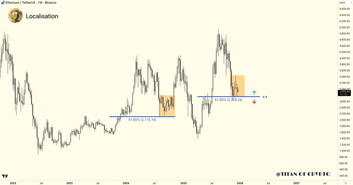 قال المستثمر والتاجر Titan of Crypto إن “ETH قد تراجعت بالفعل بنسبة 61.8٪ عن حركتها المندفعة الأخيرة”، مضيفًا أنها حاليًا عند مستوى يتفاعل فيه السعر غالبًا، كما رأينا في منتصف عام 2024.