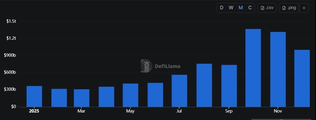 وفي ديسمبر وحده، وصل حجم التداول الدائم إلى تريليون دولار، حاملاً الزخم الذي بدأ في أكتوبر، عندما وصلت الأحجام الشهرية لأول مرة إلى تريليون دولار.
