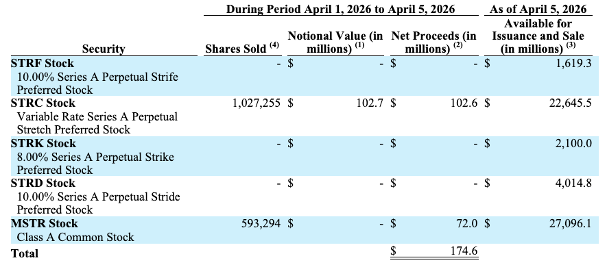 خلال الفترة من 30 إلى 31 مارس، باعت شركة Strategy ما يقرب من 2.28 مليون سهم في STRC و582.550 سهمًا في MSTR، مما أدى إلى تحقيق عائدات صافية تبلغ حوالي 299.3 مليون دولار. في الفترة من 1 إلى 5 أبريل، باعت الشركة مليون سهم إضافي في STRC و593,294 سهمًا في MSTR، مما أدى إلى جمع ما يقرب من 174.6 مليون دولار.