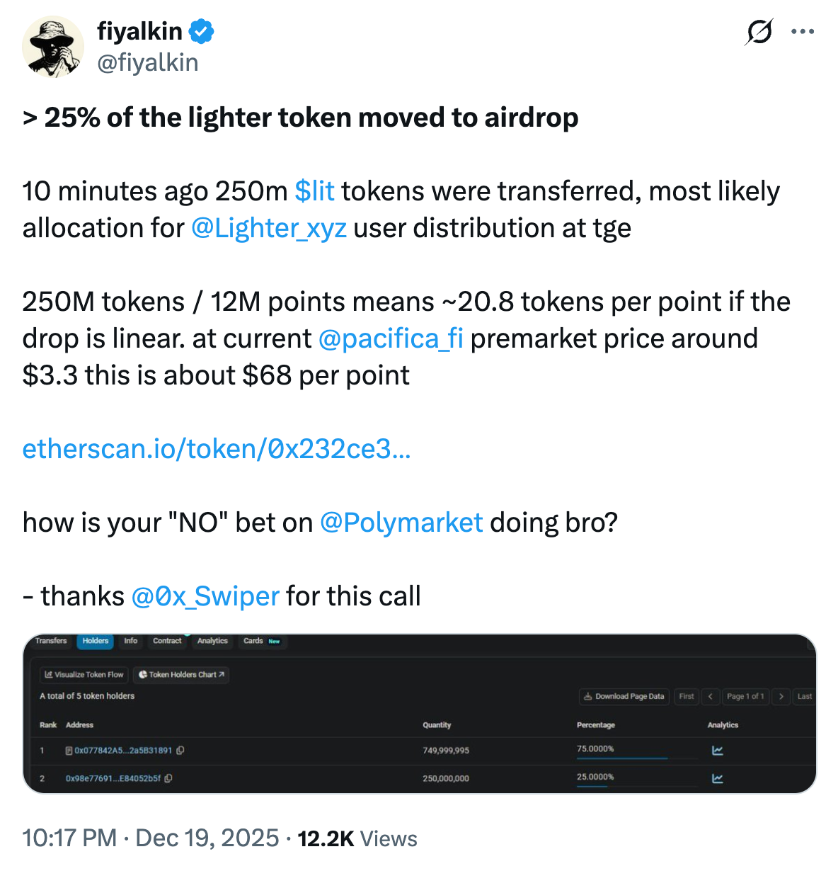 قامت Lighter بتحويل 250 مليون من رموز LIT – تمثل 25٪ من إجمالي العرض – يوم الجمعة، مما أثار تكهنات المجتمع بأن هذه الخطوة تشير إلى إسقاط جوي قادم للمستخدم قبل TGE، المتوقع بحلول 31 ديسمبر.