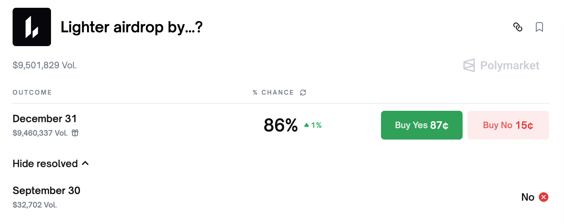 احتمالات Polymarket على Lighter Airdrop تبلغ 86٪