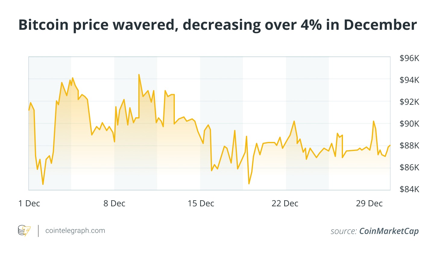 استمر سعر البيتكوين في الانخفاض مع اقتراب عام 2025 من نهايته، حيث انخفض بنسبة 4٪ في ديسمبر.