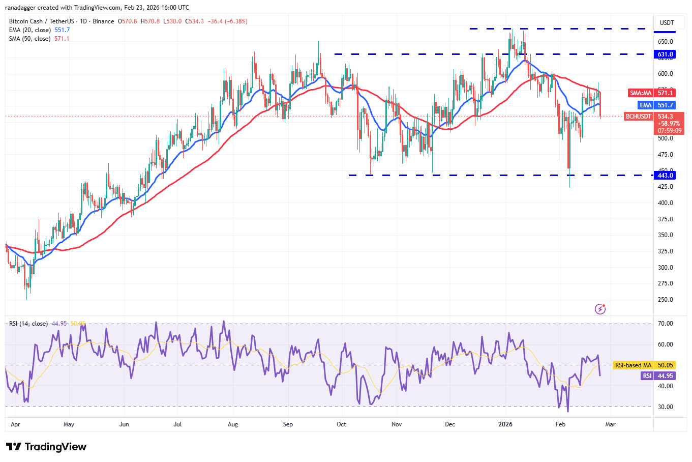 باع المضاربون على الانخفاض بقوة وسحبوا سعر Bitcoin Cash إلى ما دون المتوسط المتحرك الأسي البالغ 20 يومًا (551 دولارًا). إذا ظل السعر أقل من 538 دولارًا أمريكيًا، فقد ينخفض زوج BCH/USDT إلى مستوى الدعم القوي عند 500 دولار أمريكي. من المتوقع أن يدافع المشترون بقوة عن مستوى 500 دولار، حيث أن الإغلاق تحته قد يؤدي إلى انخفاض الزوج إلى 443 دولارًا.