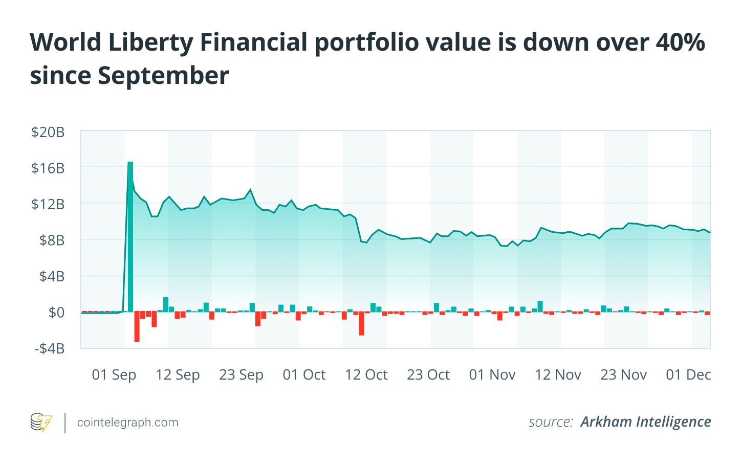 انخفضت القيمة الإجمالية لمحفظة World Liberty Financial بشكل ملحوظ. على الرغم من هذا الانخفاض الملحوظ في القيمة، فإن World Liberty Financial تمضي قدمًا في الأصول والصفقات الجديدة. وفي الثالث من ديسمبر، أعلن مؤسسها المشارك، زاك ويتكوف، أنه سيطلق مجموعة من أصول العالم الحقيقي (RWAs) بدءًا من يناير عام 2026.