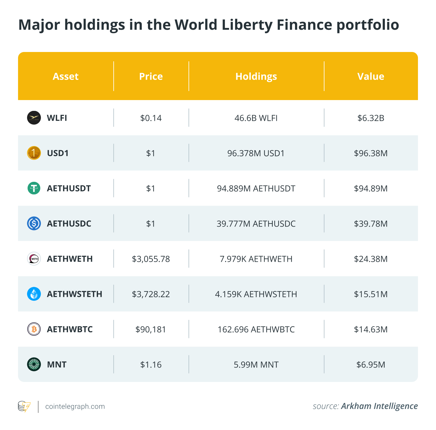 في الاتجاه الصعودي الذي حدد جزءًا كبيرًا من سوق العملات المشفرة لعام 2025، قامت WLFI بالعديد من عمليات الاستحواذ الكبيرة على العملات المشفرة. وقد اشترت سلة من الأصول بقيمة ملايين الدولارات، بما في ذلك 21.5 مليون دولار من Bitcoin المغلف (WBTC) والإيثريوم (ETH) والموف (MOVE). اعتبارًا من 22 ديسمبر، تتضمن أهم العملات المعدنية في الصندوق أيضًا ممتلكات كبيرة بقيمة 1 دولار أمريكي، والعديد من الأصول المرتبطة بـ Aave، بالإضافة إلى Mantle (MNT).