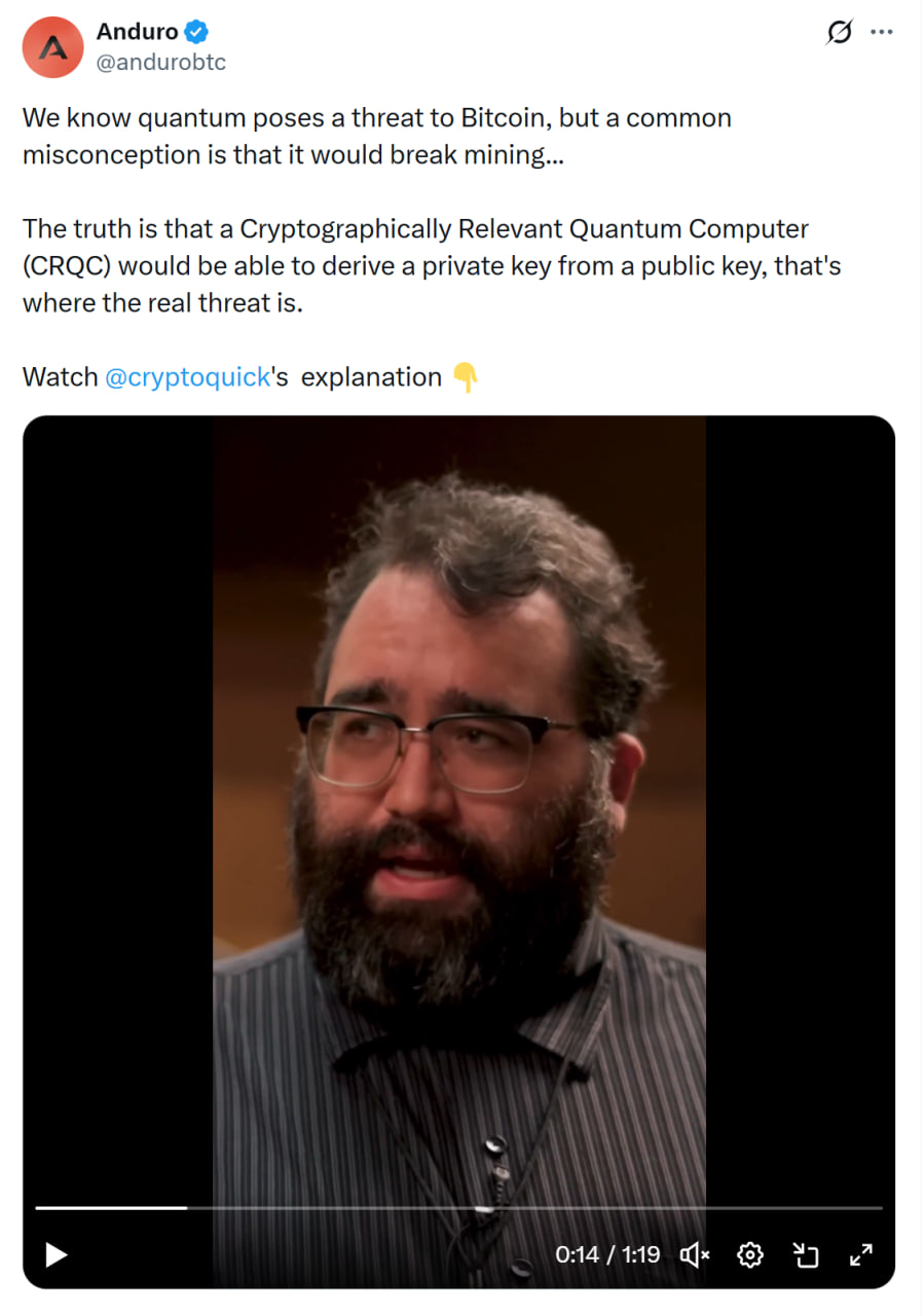 وكان نيك بوكرين، محلل العملات المشفرة والمؤسس المشارك لشركة Coin Bureau، أكثر صراحة. وقال: “إن رواية “التهديد الكمي لبيتكوين” بأكملها هي تسويق بنسبة 90٪ وتهديد وشيك بنسبة 10٪ … نحن بالتأكيد على بعد عقد من الزمن على الأقل من أجهزة الكمبيوتر التي يمكنها بالفعل كسر التشفير الحالي”.