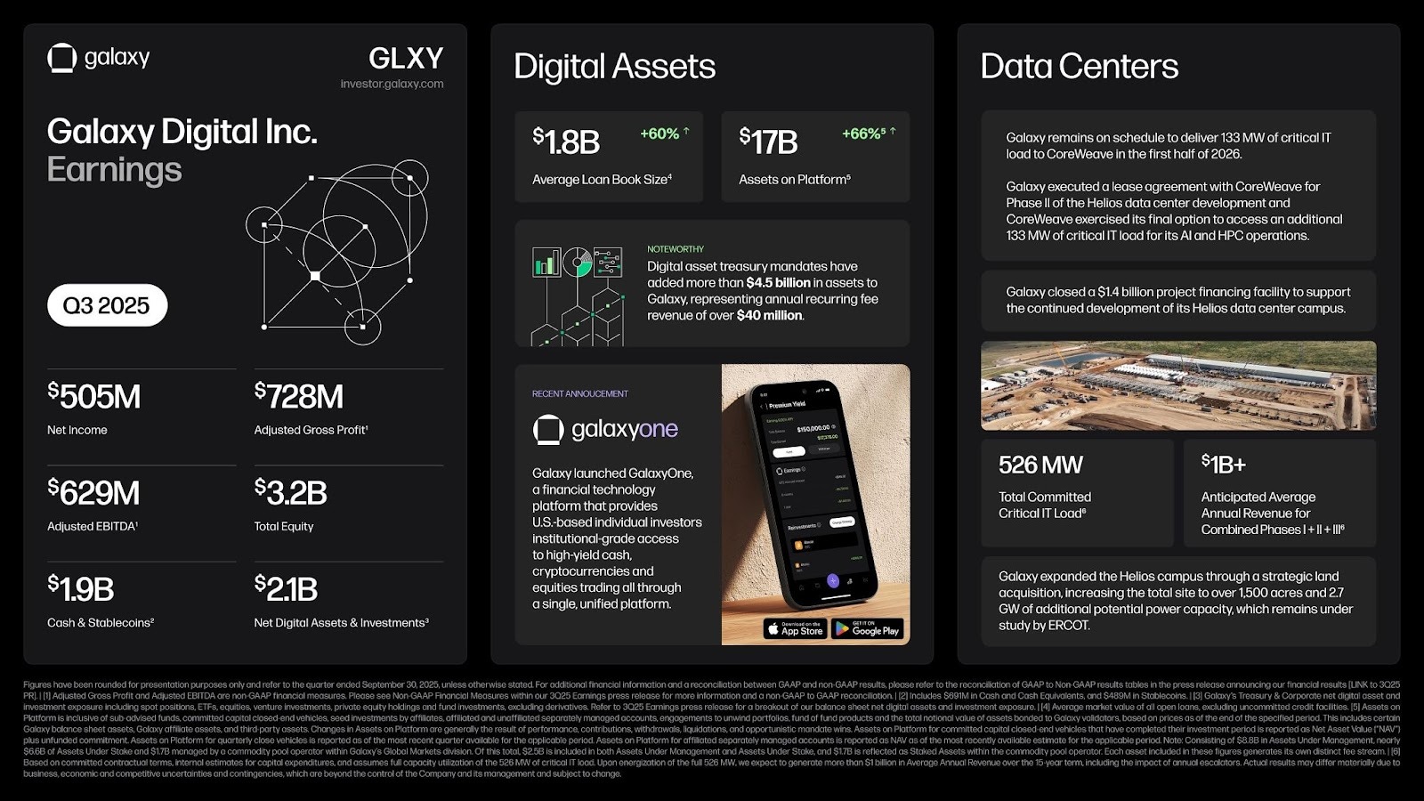 سجلت الشركة دخلاً صافيًا قدره 505 مليون دولار أمريكي لهذا الربع، مع أرباح معدلة قدرها 629 مليون دولار أمريكي، مدفوعة بمكاسب في عمليات الأصول الرقمية والاستثمارات. تمتلك Galaxy الآن 3.2 مليار دولار من الأسهم، بما في ذلك 1.9 مليار دولار نقدًا وعملات مستقرة، في حين ارتفعت أحجام التداول الإجمالية بنسبة 140٪ عن الربع السابق.