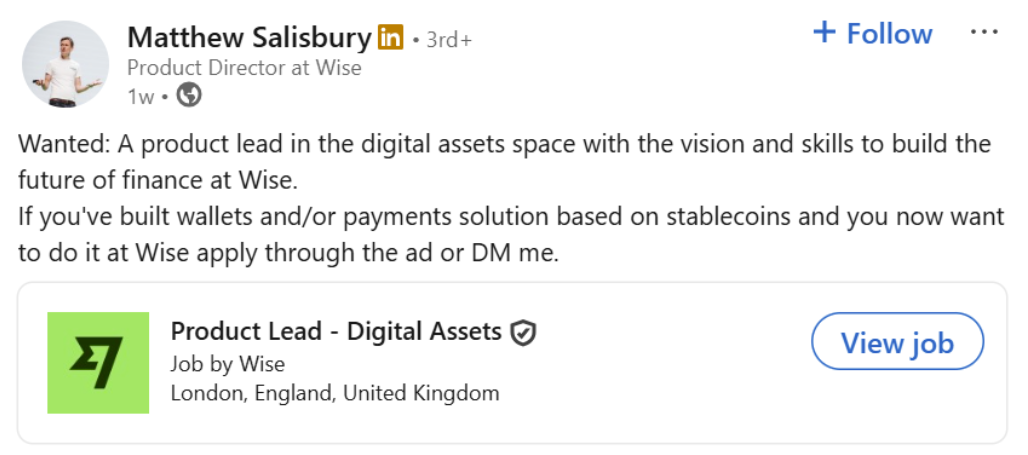 كتب سالزبوري: “إذا قمت بإنشاء محافظ و/أو حل مدفوعات يعتمد على العملات المستقرة وتريد الآن القيام بذلك في Wise، فقم بالتقدم من خلال الإعلان أو عبر رسالة مباشرة”.