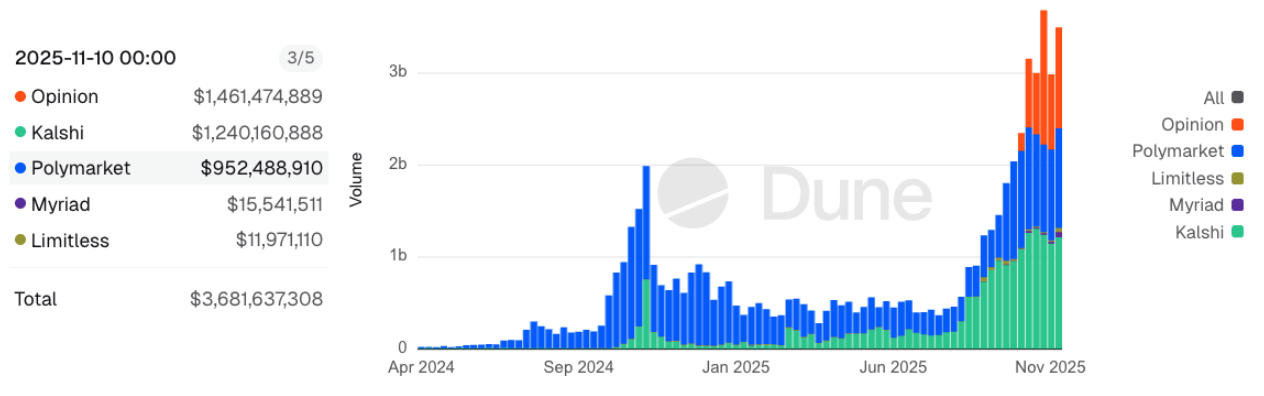 سجلت Opinion حجمًا أسبوعيًا قدره 1.5 مليار دولار، واستحوذت على 40% من السوق البالغة 3.7 مليار دولار، محطمة جميع الأرقام القياسية المتوقعة في السوق السابقة، بما في ذلك ذروة Polymarket في نوفمبر 2024 خلال الانتخابات الرئاسية الأمريكية.