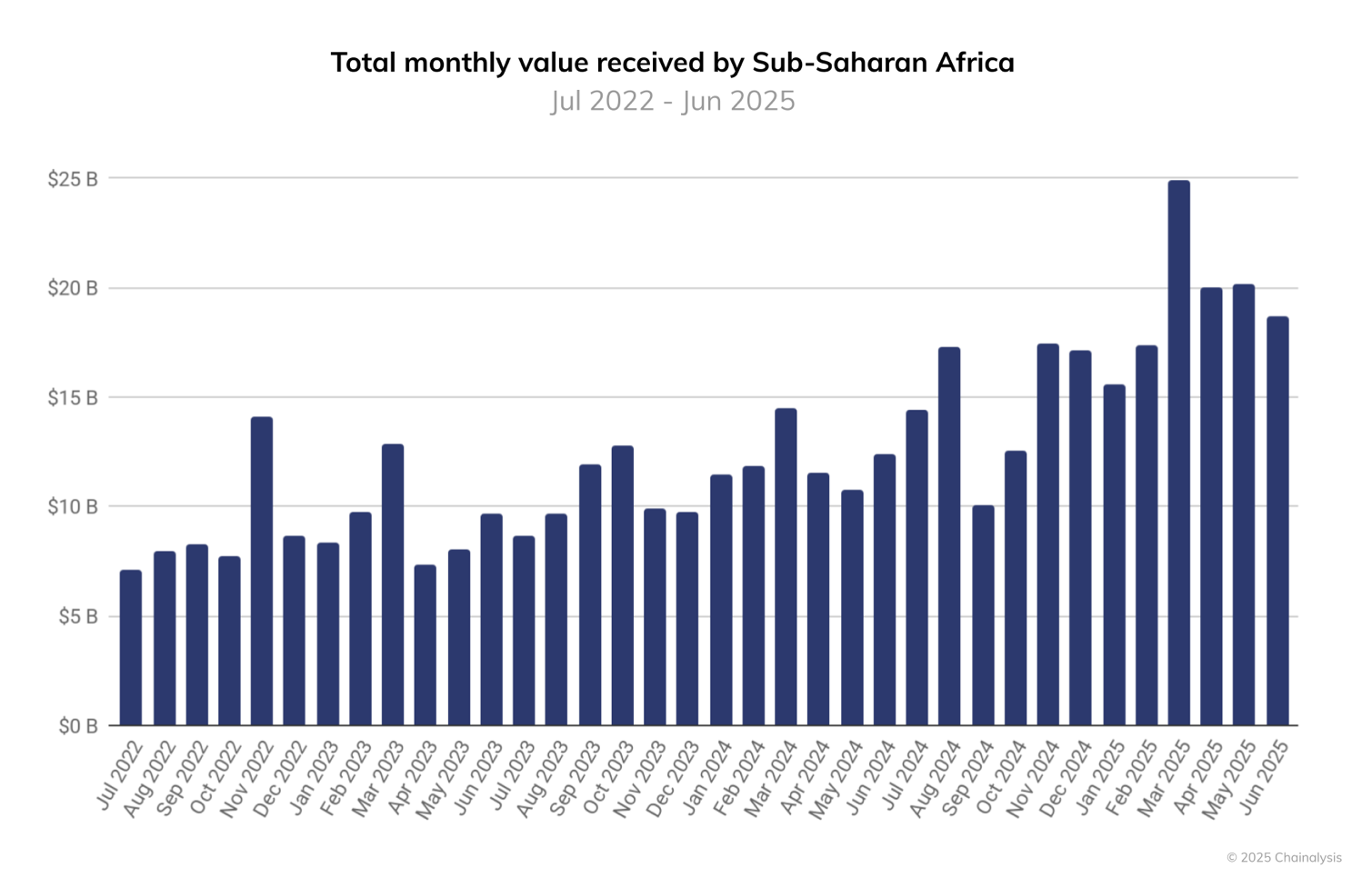 أظهر تقرير تشيناليسيس في سبتمبر أن منطقة جنوب الصحراء الكبرى في أفريقيا هي من بين أسرع المناطق نموًا في العالم لاعتماد العملات المشفرة. تلقت المنطقة أكثر من 205 مليار دولار أمريكي من قيمة onchain في الفترة من يوليو 2024 إلى يونيو 2025، أي بزيادة قدرها 52٪ تقريبًا على أساس سنوي، لتحتل المرتبة الثالثة على مستوى العالم.