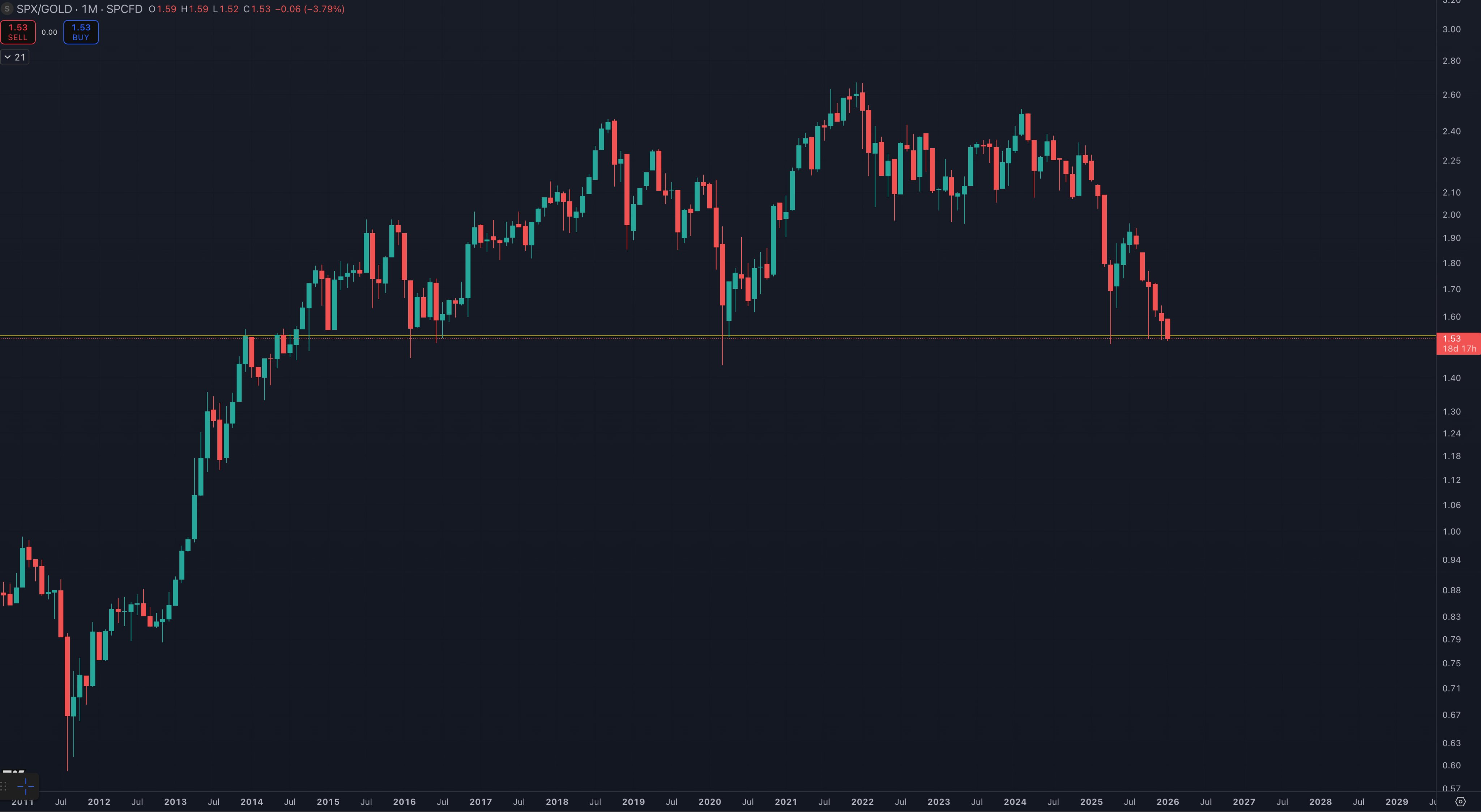 وقال حول الرسم البياني الشهري: “إذا انهار مؤشر SPX مقابل الذهب، فإن البيئة التي وجدنا أنفسنا فيها خلال العقد الماضي ستتغير تمامًا”.