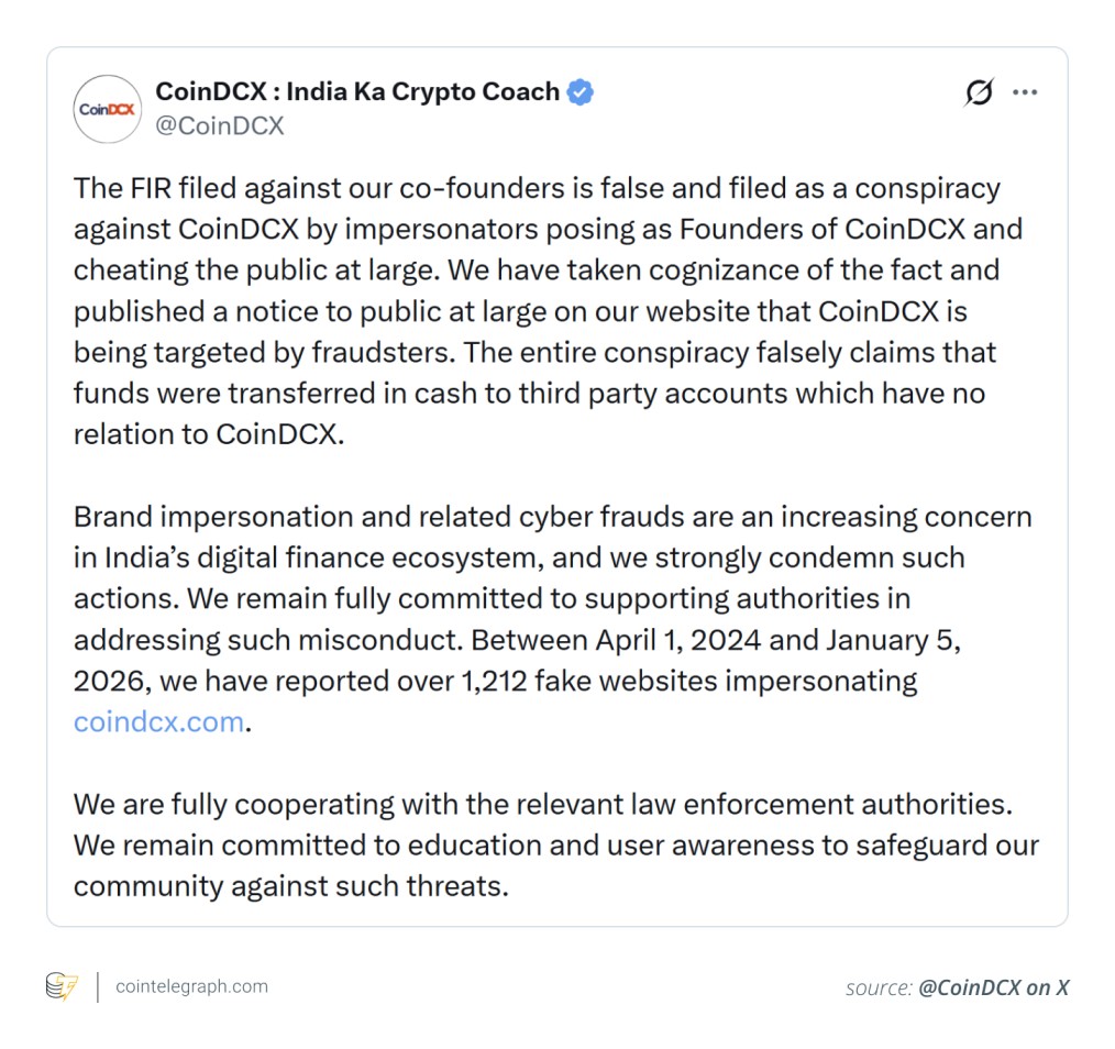 ووفقًا للبيانات الصادرة عن CoinDCX، لم تتم معالجة أي أموال مرتبطة بهذا الأمر من خلال أنظمة الصرف الخاصة بها. لم تنشأ عملية الاحتيال داخل المنصة نفسها. وبدلاً من ذلك، زُعم أن جهات فاعلة خارجية استخدمت اسمها وسمعتها كطعم.