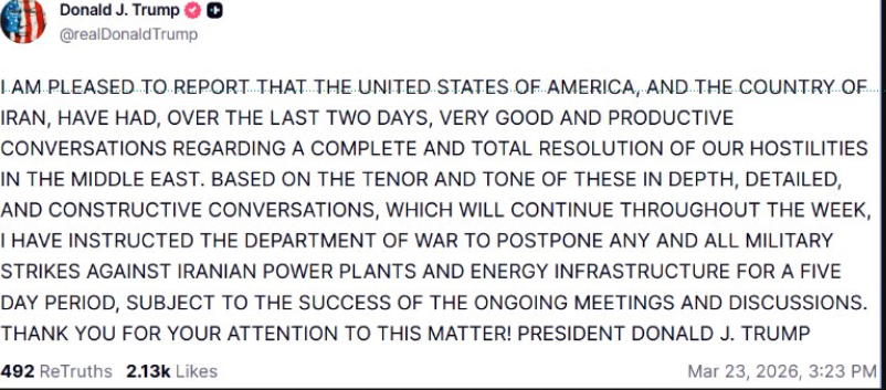 جاء رد فعل السعر على إعلان الرئيس ترامب عن وقف الضربات العسكرية الأمريكية المخطط لها لمدة خمسة أيام ضد محطات الطاقة الإيرانية والبنية التحتية للطاقة بعد مناقشات “جيدة ومثمرة للغاية” مع طهران.