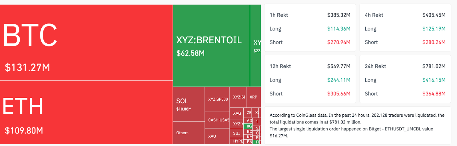 وبذلك يصل إجمالي عمليات التصفية عبر سوق العملات المشفرة خلال الـ 24 ساعة الماضية إلى 781 مليون دولار.