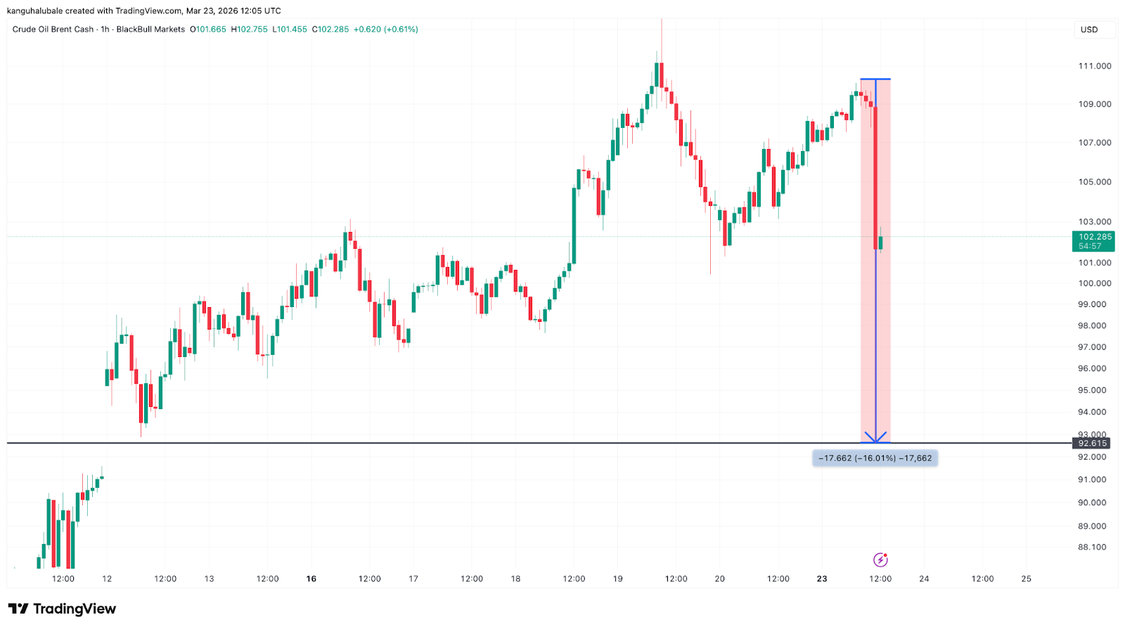 وانخفض النفط، وهو عامل خطر كلي رئيسي، بما يصل إلى 16% إلى 92 دولارًا من أعلى مستوى خلال اليوم عند 110 دولارات، في حين انخفض خام غرب تكساس الوسيط إلى أقل من 85 دولارًا – وهو أكبر انخفاض في يوم واحد منذ أواخر عام 2025.