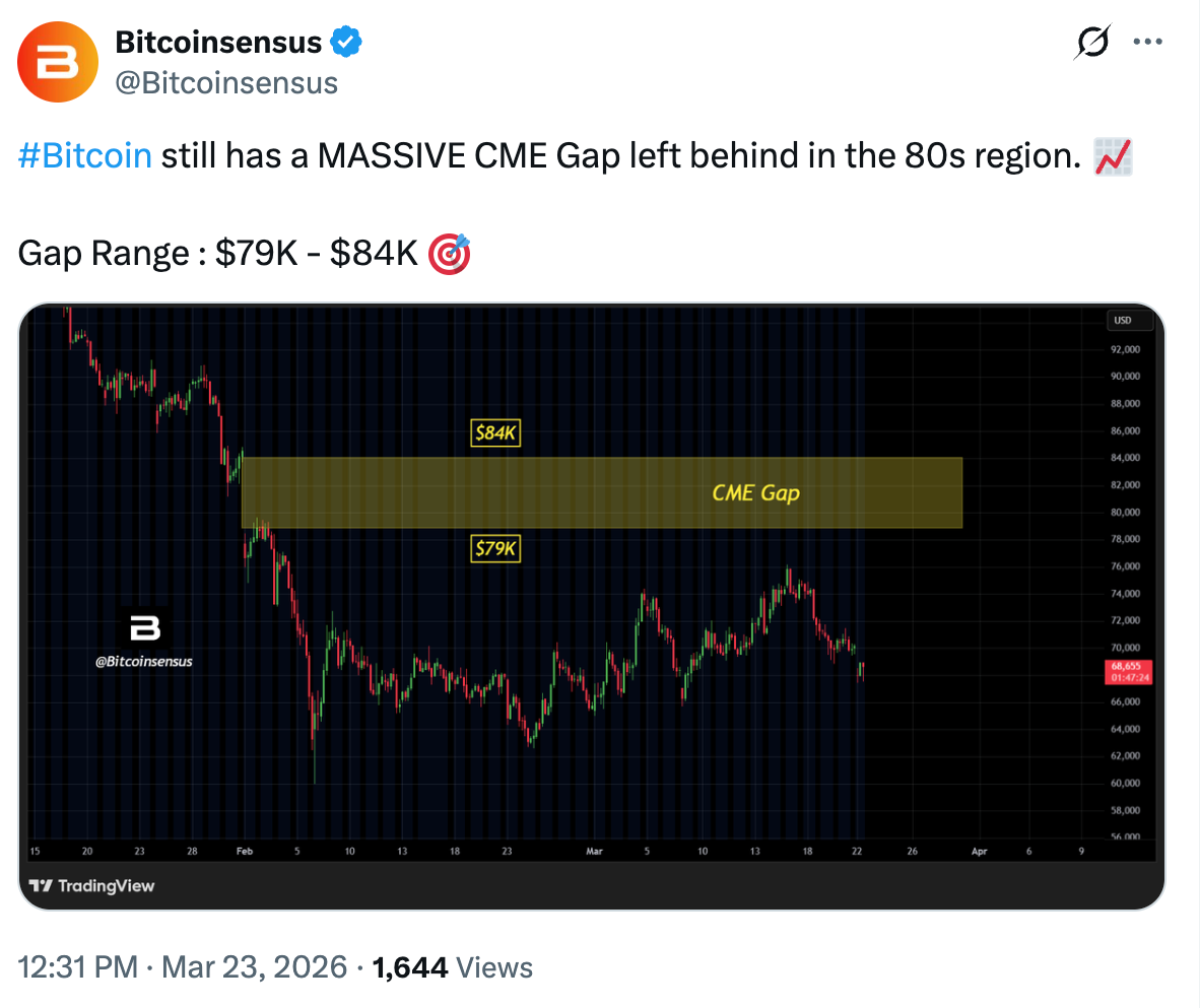 بدأت Bitcoin الأسبوع بفجوة كبيرة في CME تبلغ حوالي 70.000 دولار. وقد تم الآن سد هذه الفجوة مع الارتفاع الأخير في الأسعار. سيركز المتداولون الآن على المرحلة التالية بالقرب من منطقة 80 ألف دولار.