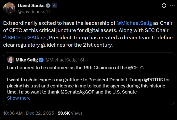 وجاءت تعليقاته في أعقاب التطورات في لجنة تداول السلع الآجلة (CFTC)، بما في ذلك تغييرات القيادة التي شملت مايك سيليج، مما يؤكد التوقعات بإطار تنظيمي أكثر تحديدًا للأصول الرقمية.