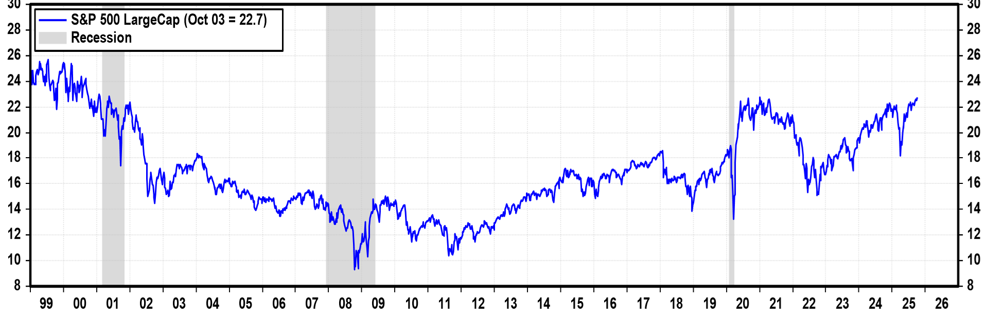 وفقًا لبيانات أبحاث Yardeni ، يجلس S&P 500 إلى الأمام إلى الأرباح التي تقل عن 23 مرة ، أي أقل بكثير من الذروة التي شوهدت 25 مرة في عام 2000 ، مما يعني أنه لا يزال هناك مجال للتوسع المتعدد في ظل المعنويات المواتية.