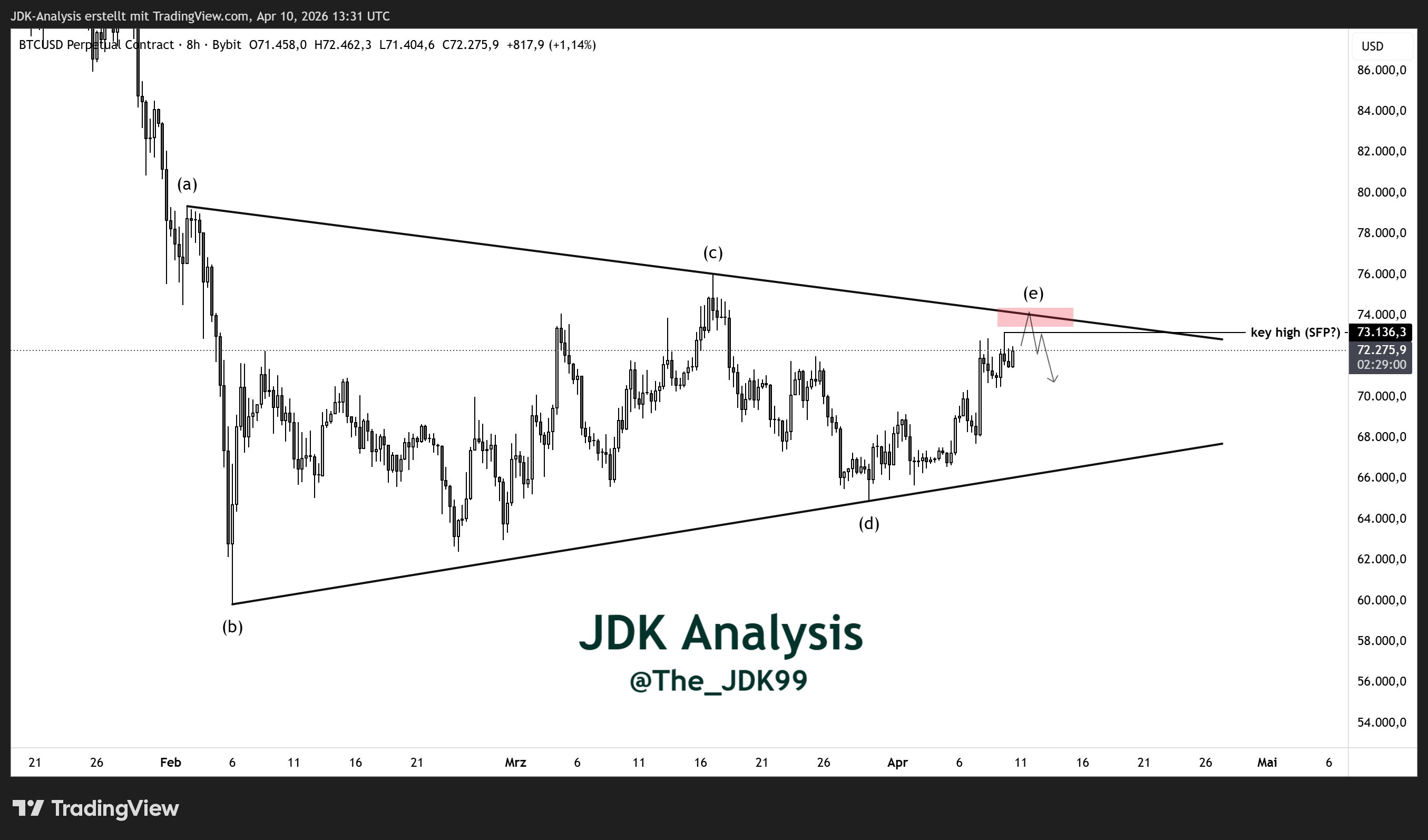 في أحدث تحليل لـ X، أشار تحليل المتداول JDK إلى أن زوج BTC/USD يتحرك ضمن إسفين ضيق – وهو موضوع نقاش منذ فبراير.