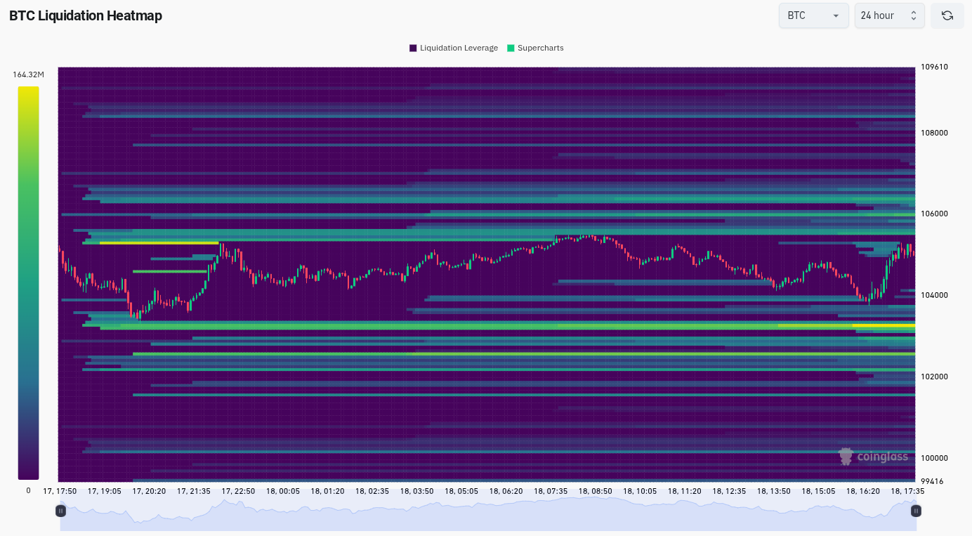 توضح بيانات دفتر الطلبات من مراقبة الموارد coinglass أن المنطقة حوالي 103،000 دولار مسبقة بشكل خاص لتكون بمثابة مغناطيس الأسعار على المدى القصير في حالة حدوث الاستيلاء على السيولة.