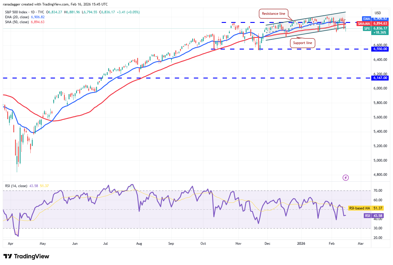 المتوسطات المتحركة على وشك التقاطع الهبوطي، ومؤشر القوة النسبية (RSI) في المنطقة السلبية، مما يشير إلى أن الدببة يعودون. قد يبدأ المؤشر في تصحيح أعمق إلى 6,720 ثم إلى دعم قوي عند 6,550 إذا انخفض السعر إلى ما دون مستوى 6,780.