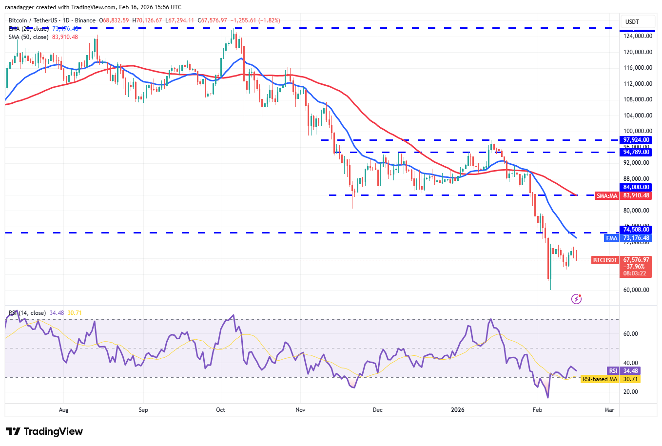 سيتعين على المشترين دفع سعر البيتكوين فوق مستوى الانهيار البالغ 74,508 دولارًا للإشارة إلى أن الزخم الهبوطي يضعف. قد يرتفع الزوج بعد ذلك نحو المتوسط المتحرك البسيط لمدة 50 يومًا (83910 دولارًا)، حيث من المتوقع أن يقوم المضاربون على الانخفاض بدفاع قوي.