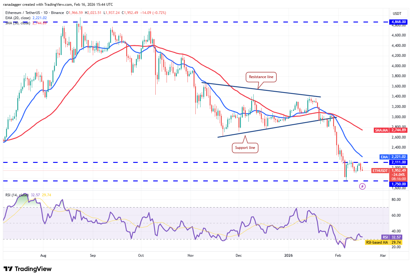 سيحاول البائعون سحب السعر إلى ما دون الدعم الفوري عند 1897 دولارًا. إذا فعلوا ذلك، فقد ينخفض زوج ETH/USDT إلى مستوى 1750 دولارًا. من المتوقع أن يدافع المشترون عن مستوى 1750 دولارًا بكل قوتهم، حيث أن الإغلاق تحته قد يؤدي إلى انخفاض الزوج إلى 1537 دولارًا.