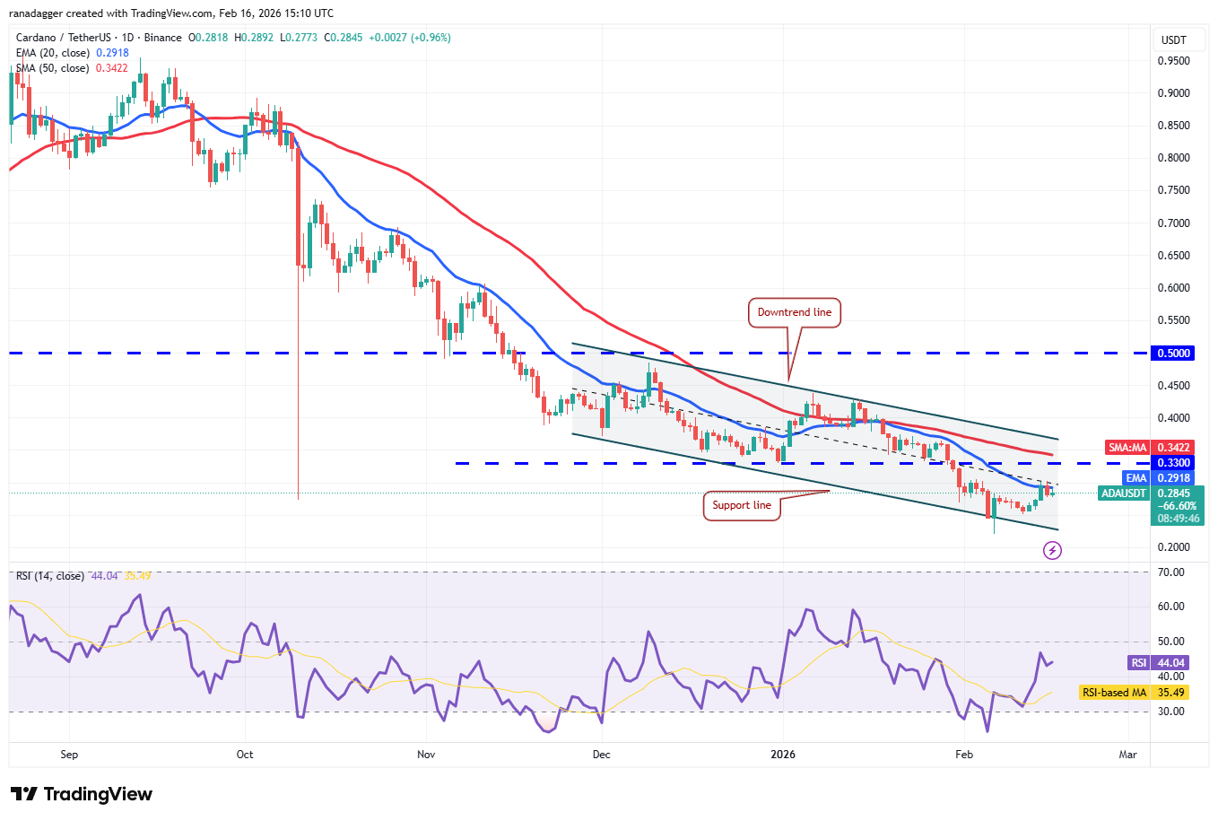 إذا لم يتخلى المضاربون على الارتفاع عن الكثير لصالح المضاربين على الانخفاض، فستزداد احتمالية الاختراق فوق المتوسط المتحرك الأسي على مدى ٢٠ يومًا. يشير ذلك إلى أن زوج ADA/USDT قد يبقى داخل القناة الهابطة لبعض الوقت. يشير الاختراق والإغلاق فوق خط الاتجاه الهبوطي إلى تغير محتمل في الاتجاه على المدى القصير.