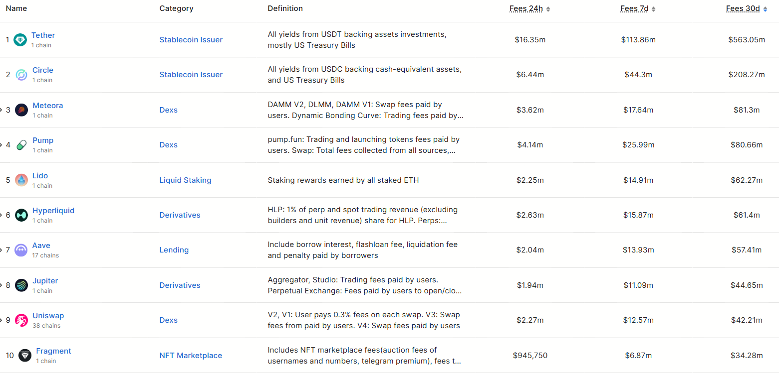 تُظهر البيانات التي جمعتها DeFiLlama أن بروتوكولات DeFi تهيمن الآن على تصنيفات منتجات التشفير الأعلى ربحًا. كانت أفضل 17 كيانًا لتوليد الرسوم على مدار الثلاثين يومًا الماضية عبارة عن تطبيقات أو بروتوكولات بدلاً من سلاسل الكتل ذات الطبقة الأساسية.