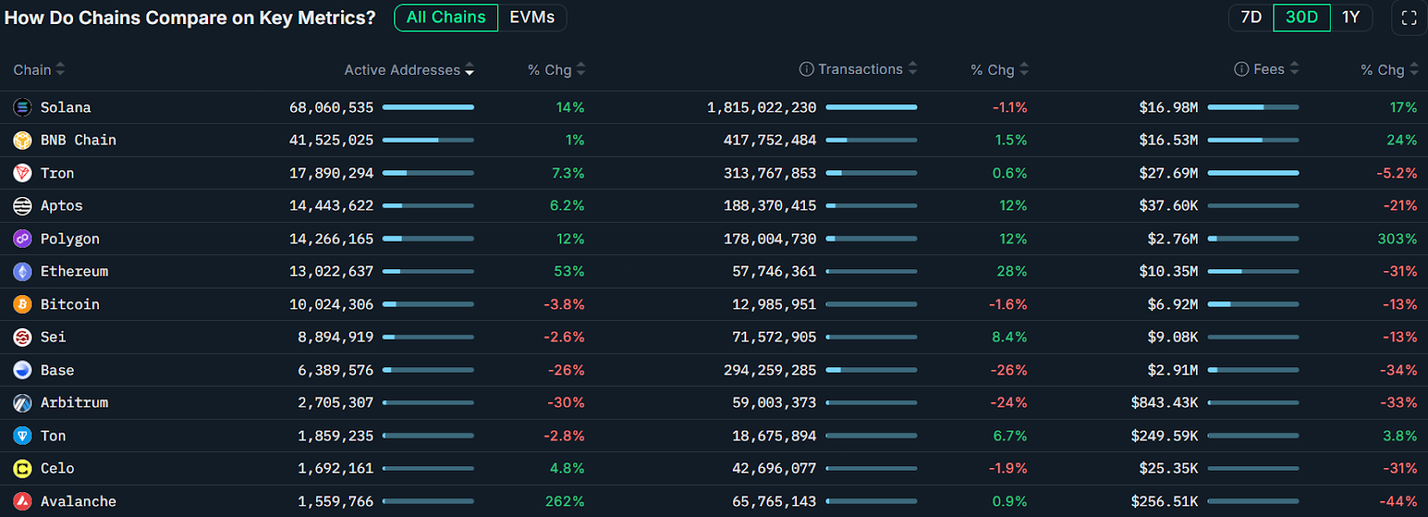 يمكن أن تعزى صدارة Solana بين السلاسل إلى نشاطها، حيث كانت Solana هي الشبكة الأكثر استخدامًا، مع أكثر من 68 مليون عنوان نشط خلال الثلاثين يومًا الماضية، بزيادة 14٪، وفقًا لمنصة استخبارات العملات المشفرة Nansen.