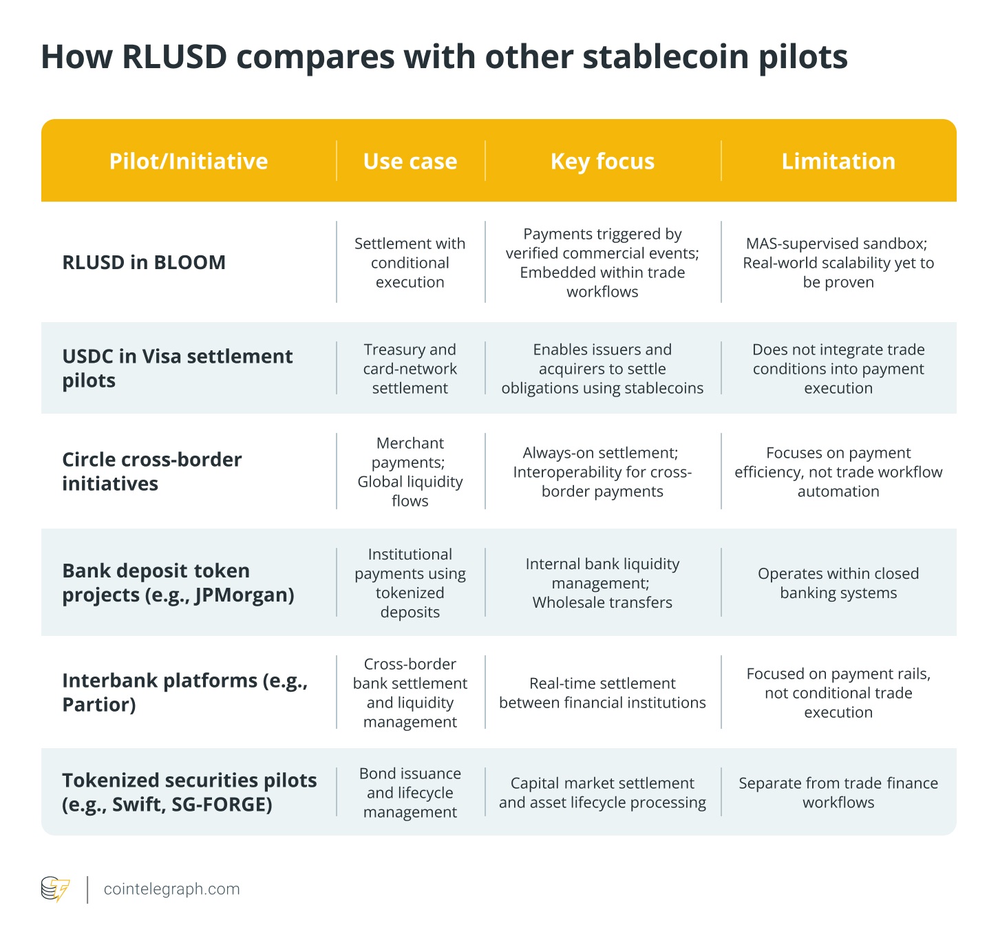يركز مشروع Ripple التجريبي في إطار مبادرة BLOOM التابعة لسلطة النقد في سنغافورة (MAS) على تحدٍ محدد: أتمتة التسوية التجارية عبر الحدود من خلال الأموال الرقمية القابلة للبرمجة.