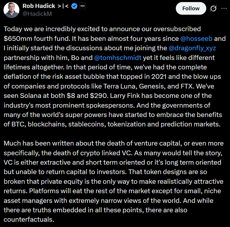 على الرغم من التغيير الأوسع في رأس المال الاستثماري للعملات المشفرة، أغلقت Dragonfly Capital صندوقها الرابع بمبلغ 650 مليون دولار، مما يشير إلى استمرار الرغبة المؤسسية في تشغيل البنية التحتية لـ blockchain.