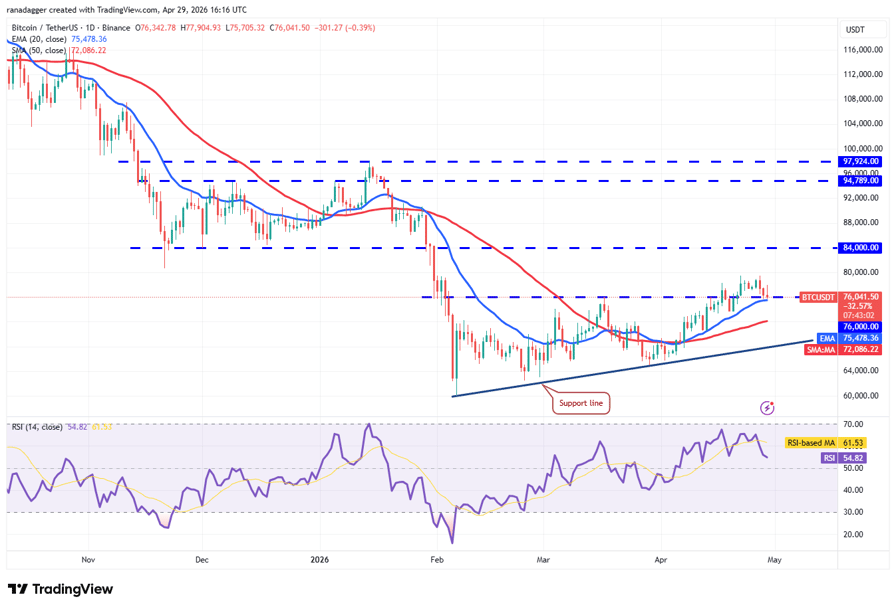 ارتدت BTC من المتوسط المتحرك الأسي لمدة 20 يومًا (75478 دولارًا) يوم الأربعاء، لكن المضاربين على الارتفاع لم يتمكنوا من الحفاظ على المستويات الأعلى.