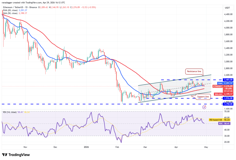 يحاول المشترون الحفاظ على الأثير (إيثريوم) فوق المتوسط المتحرك الأسي على مدى ٢٠ يومًا (٢٢٩١ دولارًا)، لكن المضاربين على الانخفاض يواصلون ممارسة الضغط.
