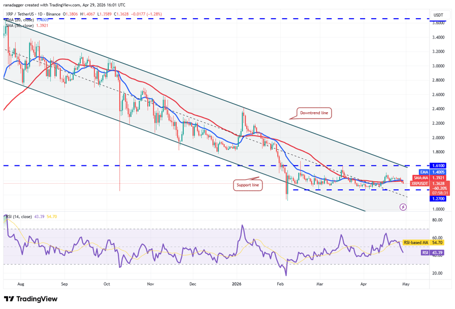 قد ينخفض سعر XRP إلى 1.27 دولارًا، حيث من المتوقع أن يقوم المشترون بدفاع قوي. إذا ارتد السعر من مستوى الدعم 1.27 دولار وارتفع فوق المتوسطات المتحركة، فقد يصل الانتعاش إلى خط الاتجاه الهبوطي. يشير الإغلاق فوق خط الاتجاه الهبوطي إلى تغير محتمل في الاتجاه.