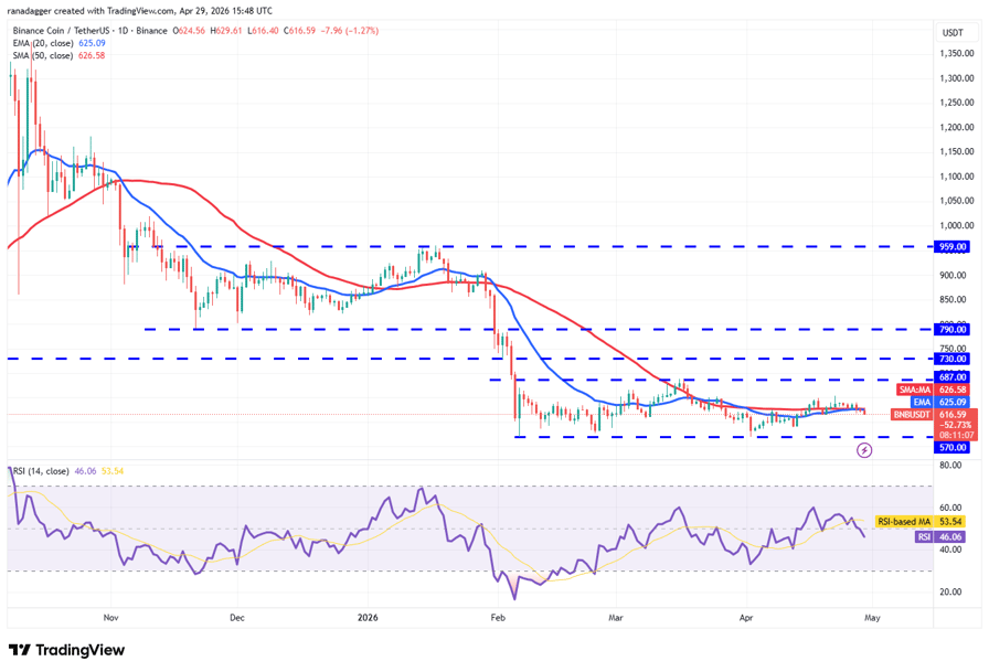 تشير المتوسطات المتحركة المسطحة ومؤشر القوة النسبية (RSI) الموجود أسفل نقطة المنتصف مباشرة إلى أن زوج BNB/USDT قد يستمر في التماسك لبعض الوقت.