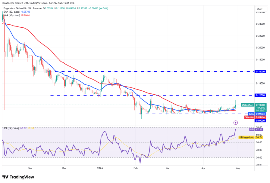 دفع المضاربون على الارتفاع سعر DOGE إلى ما فوق 0.11 دولار يوم الأربعاء، لكن الفتيل الطويل في الشمعدان يشير إلى أن المضاربين على الانخفاض ما زالوا نشطين عند مستويات أعلى. يشير الاختراق دون المتوسط المتحرك الأسي على مدى ٢٠ يومًا إلى أن زوج DOGE/USDT قد يظل ضمن نطاق يتراوح بين 0.09 دولار و0.12 دولار لبضعة أيام أخرى.