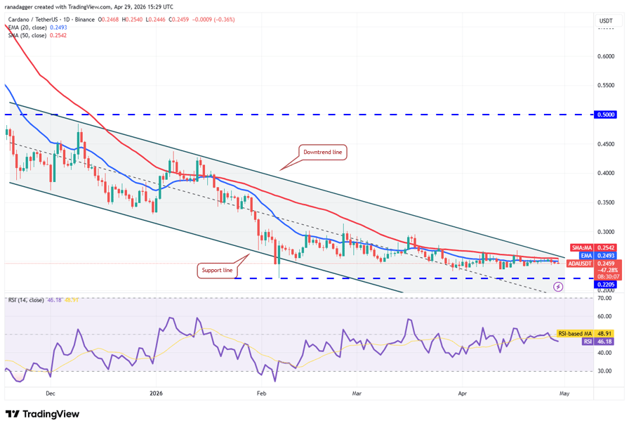 يشير ذلك إلى أن المضاربين على الارتفاع سيحاولون مرة أخرى دفع سعر ADA فوق خط الاتجاه الهبوطي. إذا نجحوا، فقد يرتفع زوج ADA/USDT إلى 0.32 دولار ثم إلى 0.37 دولار. تشير مثل هذه الخطوة إلى تغيير محتمل في الاتجاه.