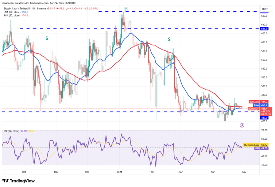 بيتكوين كاش (غرفة تبادل معلومات السلامة الأحيائية) من مستوى الدعم البالغ 443 دولارًا يوم الثلاثاء، لكن المضاربين على الارتفاع يكافحون لدفع السعر فوق المتوسطات المتحركة.